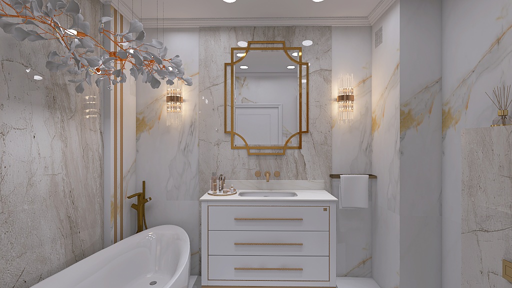 Miejsce do przechowywania stanowi ekskluzywna konsola z marmurową umywalką i pojemnymi szufladami. Złota konstrukcja oraz ozdobne uchwyty przyciągają wzrok i stanowią biżuteryjny akcent tego wnętrza.