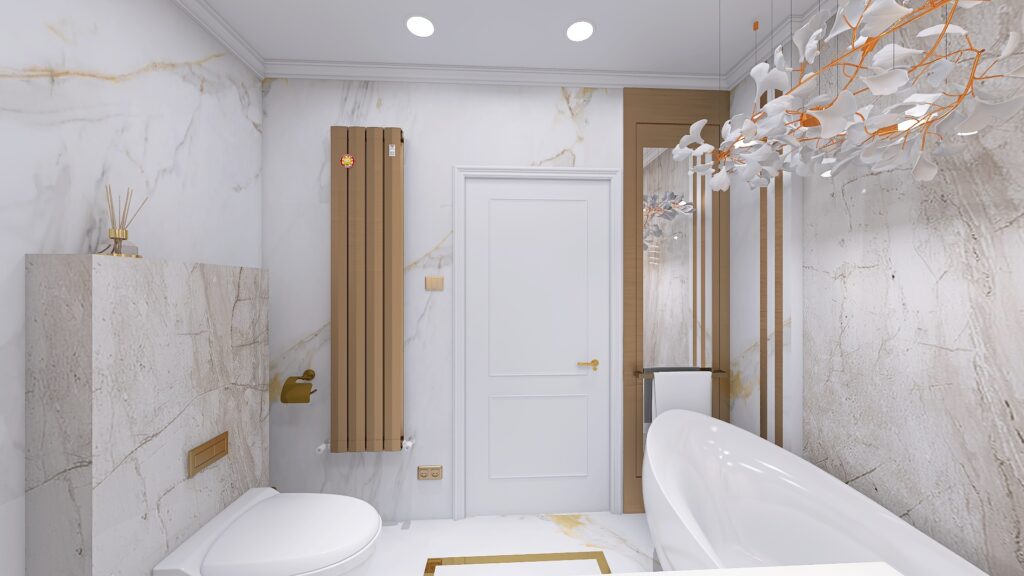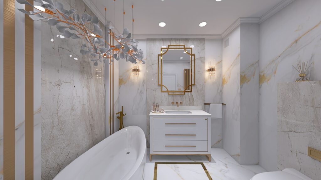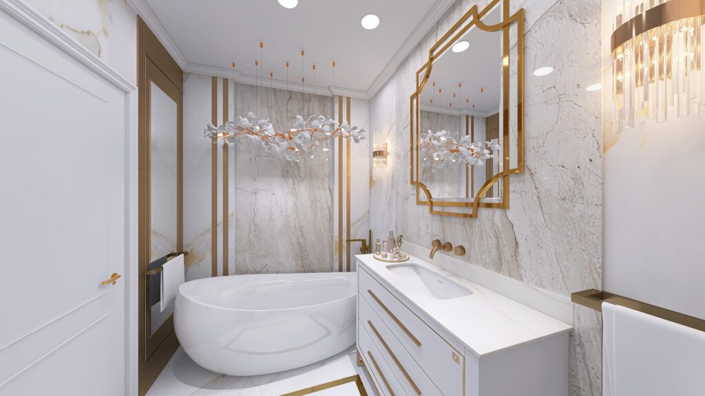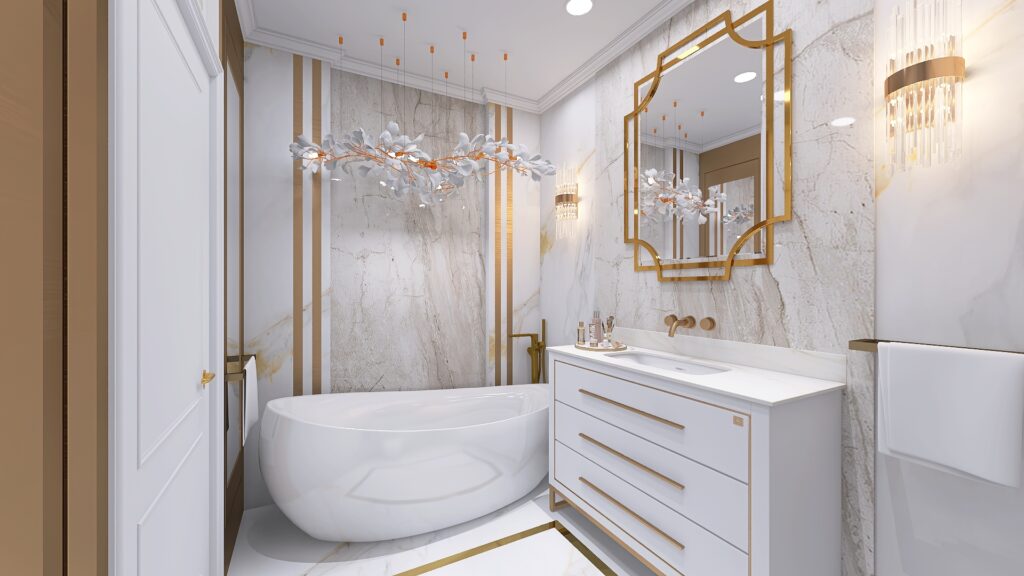 Wnętrze tej łazienki marzeń zostało zaprojektowane z połączenia włoskiego marmuru, złotych akcentów oraz odcieni kości słoniowej. Dzięki takiemu zestawieniu przestrzeń zyskała lekkość, elegancję i ponadczasowy charakter.