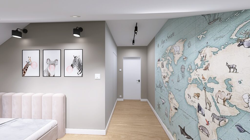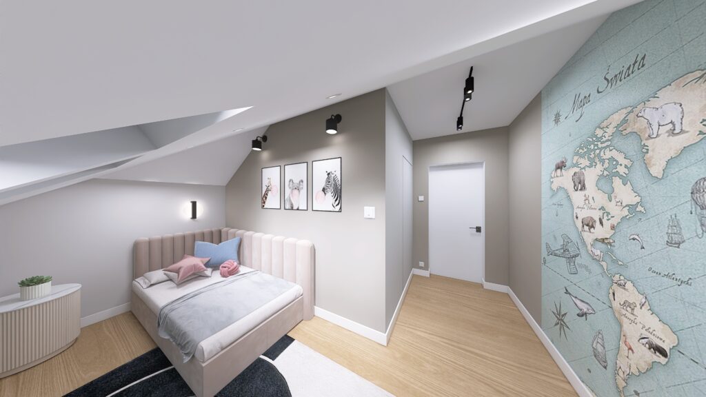 Ściana z mapą świata inspiruje i pobudza wyobraźnię, a wygodne łóżko i odpowiednie oświetlenie gwarantują komfort. Ponadto, garderoba w zabudowie pod skosem pozwala łatwo utrzymać porządek i daje miejsce na ubrania oraz drobiazgi.