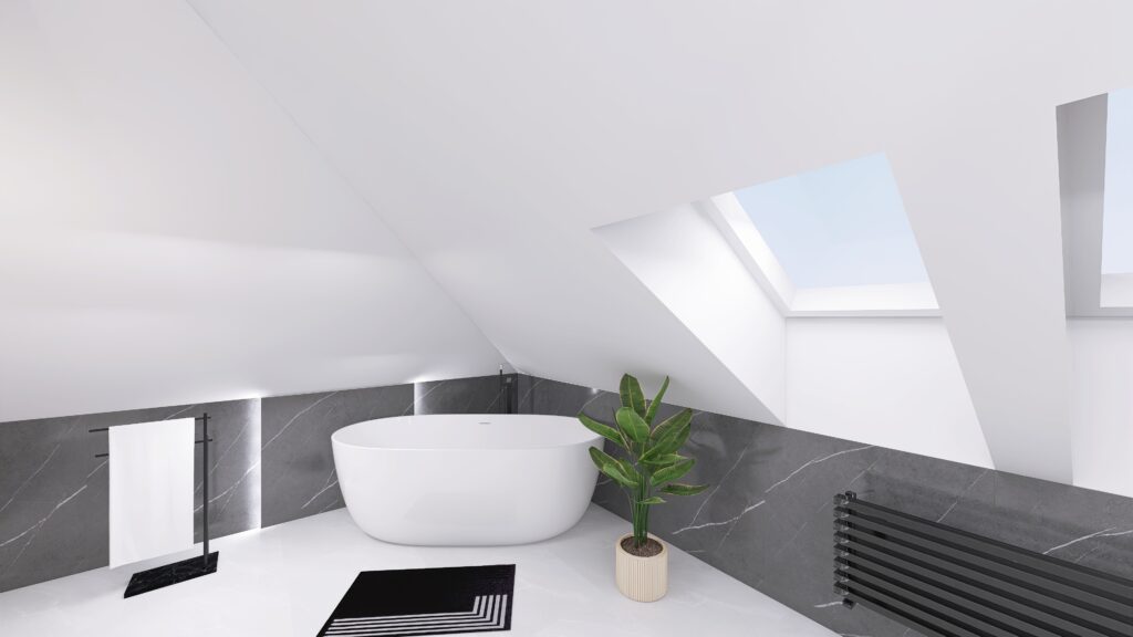 Biała, wolnostojąca wanna tworzy harmonijną kompozycję, a czarna armatura dodaje elegancji i charakteru. W efekcie powstało wnętrze nowoczesne, ale wciąż przytulne i pełne uroku.