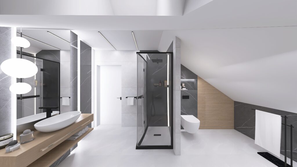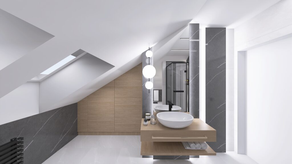 Łazienka na poddaszu może być funkcjonalna i pełna spokoju. W tym wnętrzu postawiłam na minimalistyczną elegancję, łącząc surowość betonu z naturalnym ciepłem drewna. Szare marmurowe płytki na ścianach i podłodze pięknie kontrastują z drewnianymi elementami.