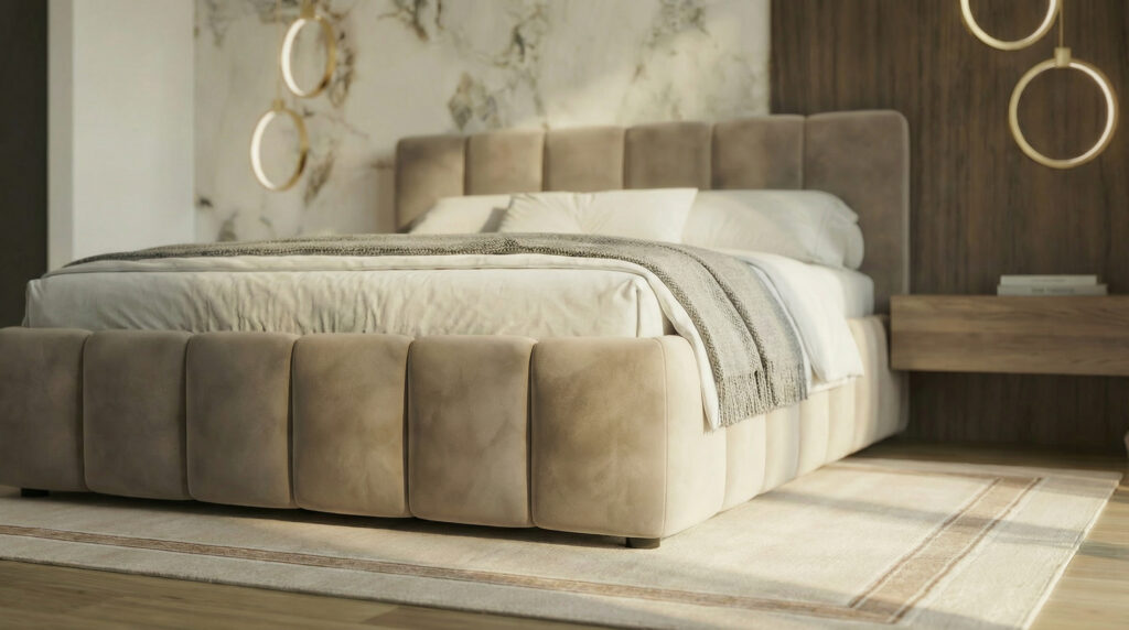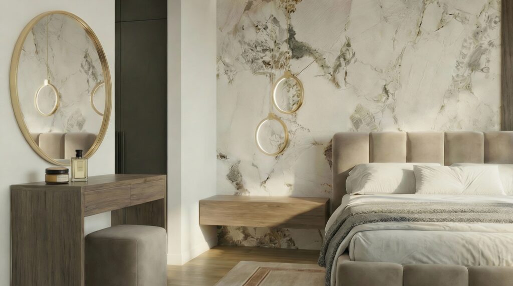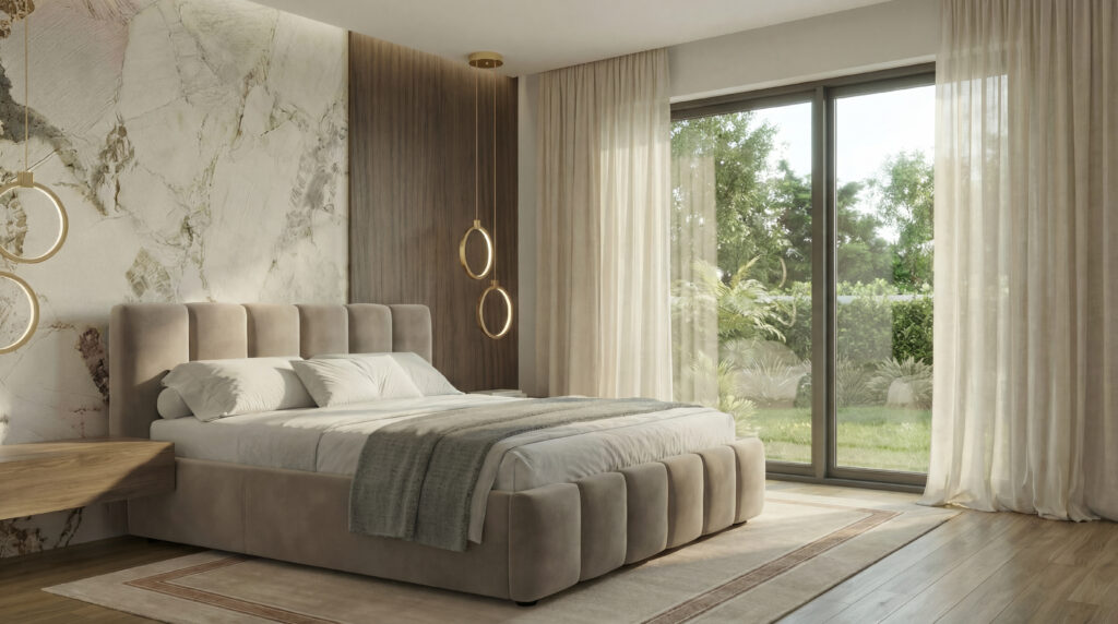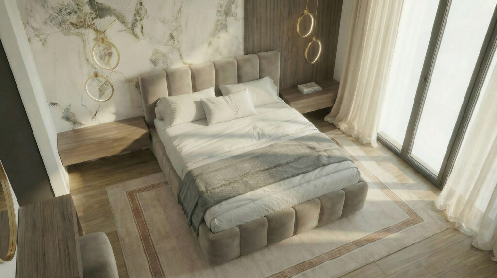 Centralnym elementem aranżacji jest tapicerowane łóżko o miękkiej, rzeźbiarskiej bryle, które nadaje wnętrzu przytulny, elegancki ton. Tło dla strefy snu stanowi kompozycja dekoracyjnych paneli ściennych — zestawienie delikatnego rysunku kamienia z ciepłą strukturą drewna buduje głębię i wprowadza wyważony kontrast, nie zakłócając atmosfery spokoju.