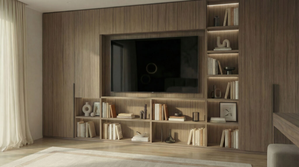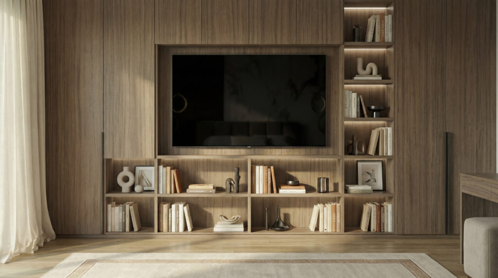 Zabudowy meblowe zaprojektowano w sposób minimalistyczny i spójny, z myślą o komforcie użytkowania oraz zachowaniu wizualnego ładu. Miękkie tkaniny, naturalne faktury i starannie dobrane proporcje sprawiają, że wnętrze jest ponadczasowe i odporne na chwilowe trendy.